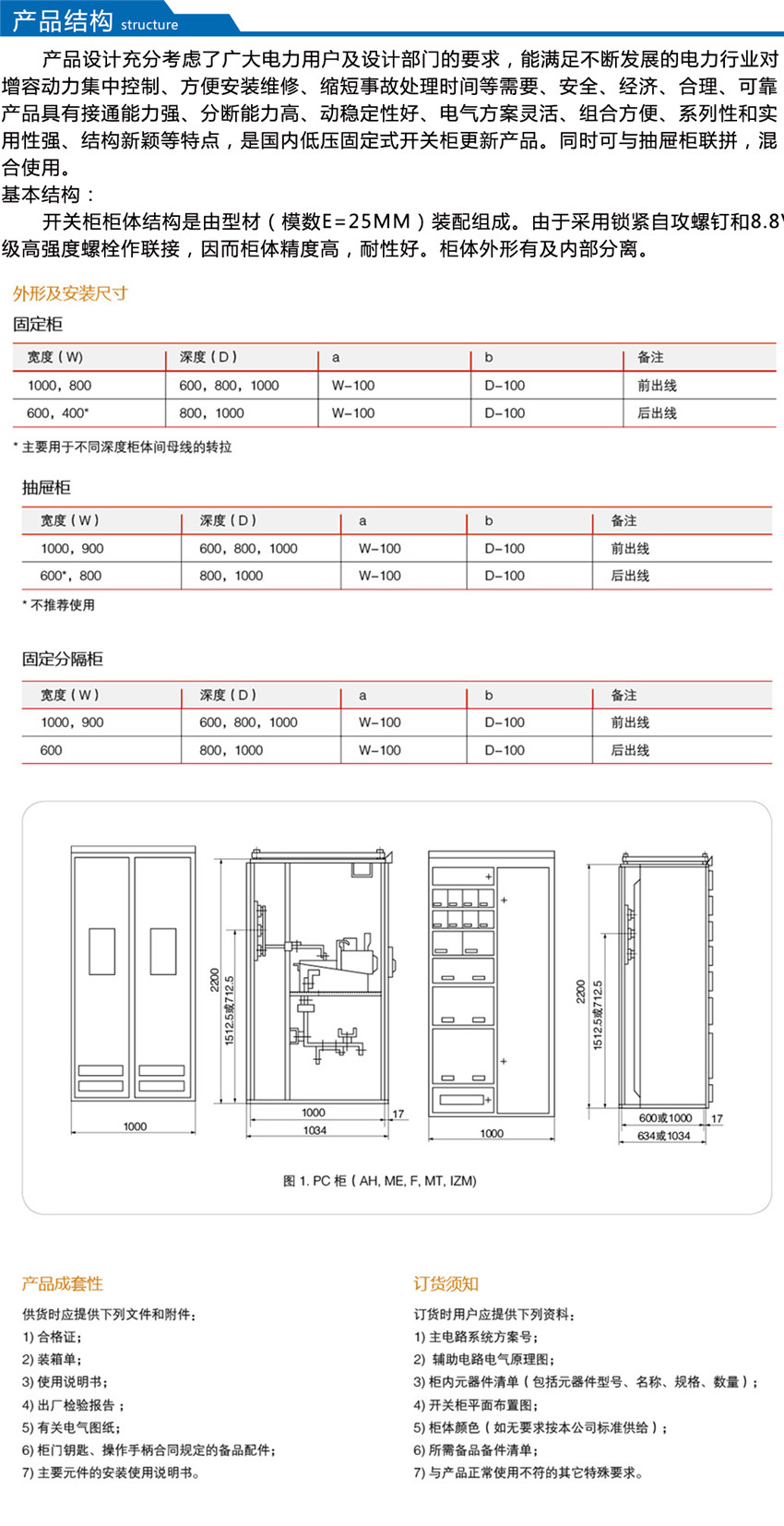 本裝置的基本柜架為組合裝配式結構,柜架的全部結構件都經過鍍鋅處理,通過自攻鎖緊螺釘或8.8級六角螺釘緊固互相連接成基本柜架,再按方案變化需要,加上相應的門、封板、隔板、安裝支架以及母線、功能單元等零部件,組裝成一臺完整的裝置,裝置內零部件尺寸、隔室尺寸實行模數化(模數單位E=25mm)。