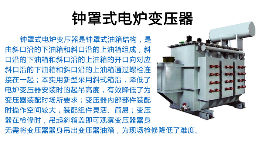 電爐變壓器斜鐘罩式油箱結(jié)構(gòu),是由斜口沿的下油箱和斜口沿的上油箱組成,斜口沿的下油箱和斜口沿的上油箱的開口向?qū)笨谘氐南掠拖浜托笨谘氐纳嫌拖渫ㄟ^螺栓連接在一起;本實用新型采用斜式箱沿,降低了電爐變壓器安裝時的起吊高度,有效降低了為變壓器裝配時場所要求;變壓器內(nèi)部部件裝配時操作空間較大,裝配組件靈活、簡易;變壓器在檢修時,吊起斜箱蓋即可觀察變壓器器身,無需將變壓器器身吊出變壓器油箱,為現(xiàn)場檢修降低了難度。