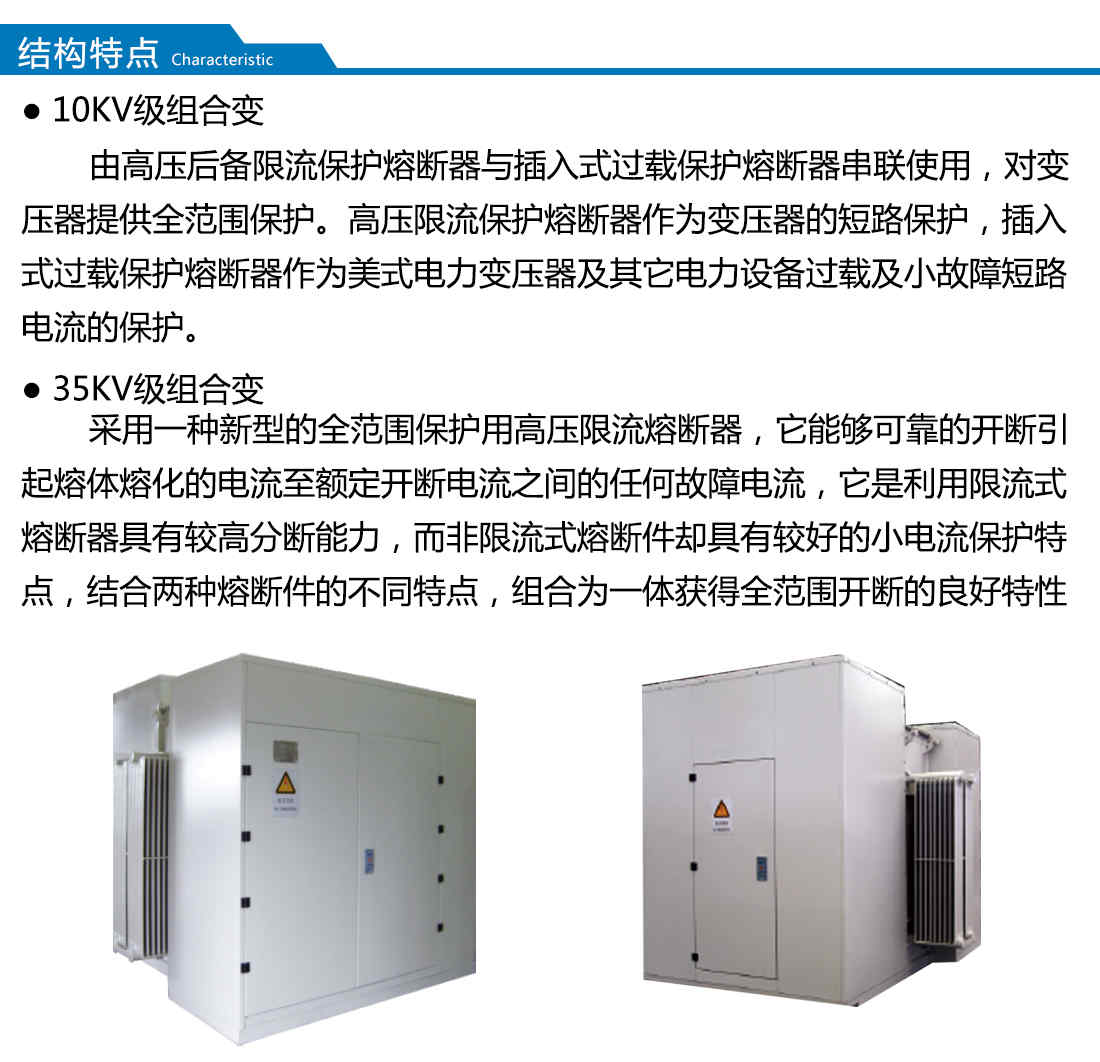 本產品是將變壓器,負荷開關,高壓熔斷器安裝在變壓器的箱體內,利用變壓器的絕緣液體作為整個產品的絕緣和散熱介質,采用全密封結構,外殼采用分體,噴丸、酸洗、磷化、分別噴涂底漆、中間漆、面漆達到表面的防腐性、耐厚性、防紫外線性均超過普通噴涂的強度,具有體積小,重量輕、安裝方便等優點。